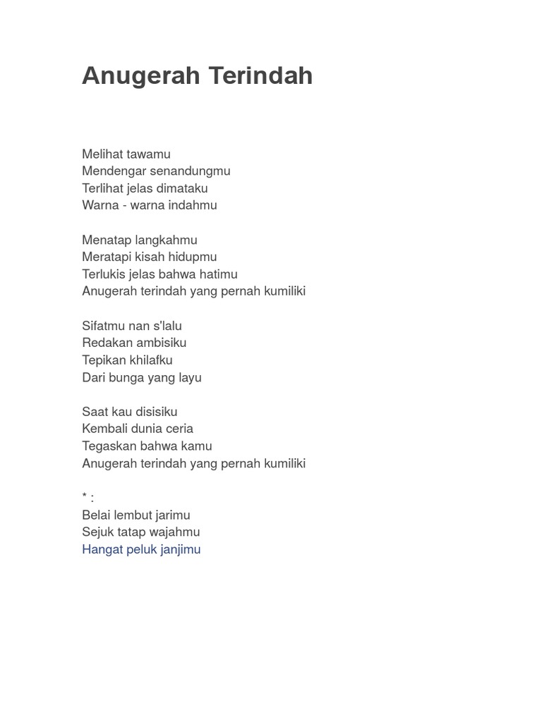 Ketik ANUGERAH kirim ke 1212INDOSAT. Download Anugerah Terindah Yang Pernah Kumiliki lagu lirik online on JOOX APP. Check out Anugerah Terindah Yang Pernah Kumiliki by Marcello Tahitoe on Amazon Music.